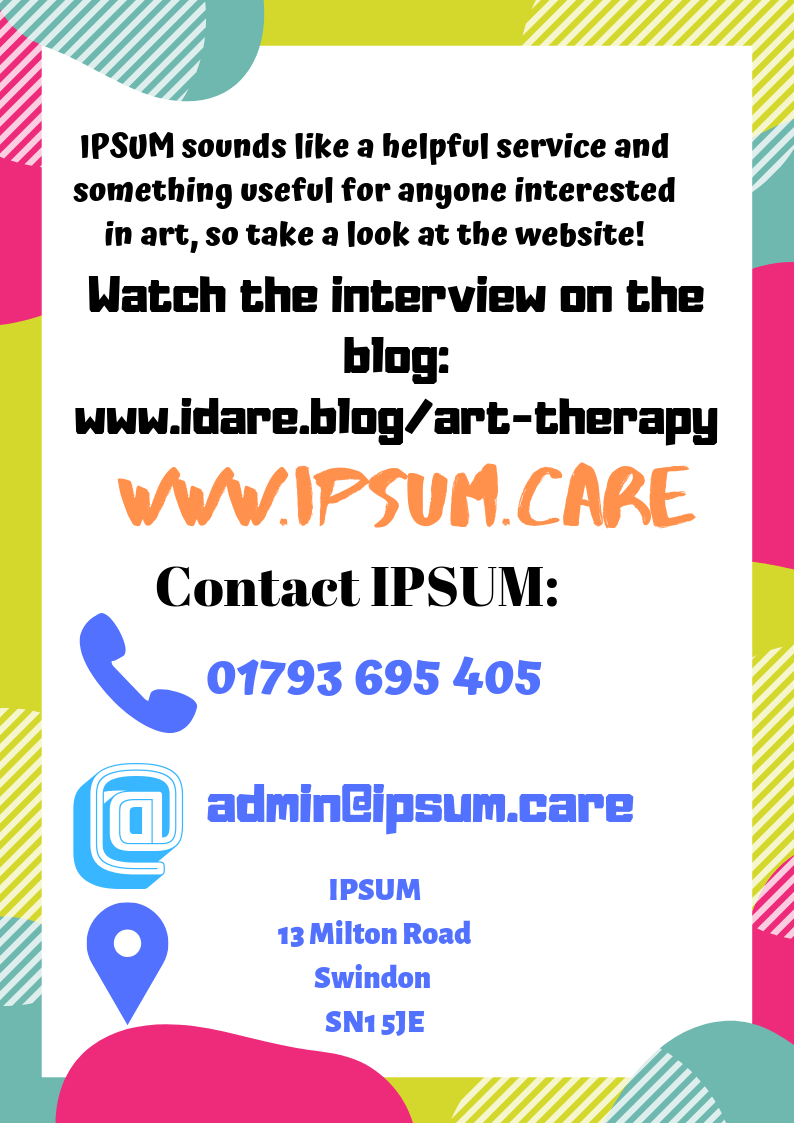 After my interview with Julie, who works at IPSUM, I learnt more about the diverting ways messages can be conveyed through art. She explained that it is useful for people who want to escape from the worries and anxieties in their life for a therapeutic experience that allows them to focus on being creative and imaginative.