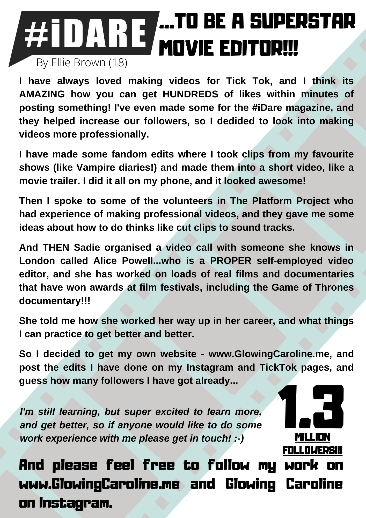 I have always loved making videos for Tick Tok, and I think its AMAZING how you can get HUNDREDS of likes within minutes of posting something! I've even made some for the #iDare magazine, and they helped increase our followers, so I dedided to look into making videos more professionally.