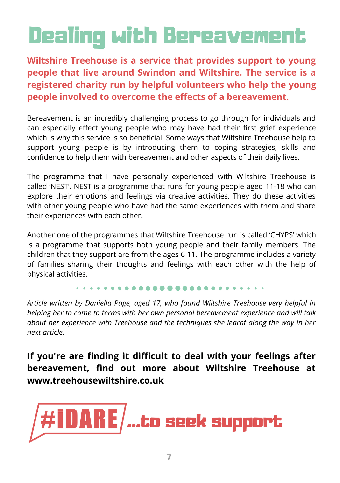If you're are finding it difficult to deal with your feelings after bereavement, find out more about Wiltshire Treehouse at www.treehousewiltshire.co.uk
