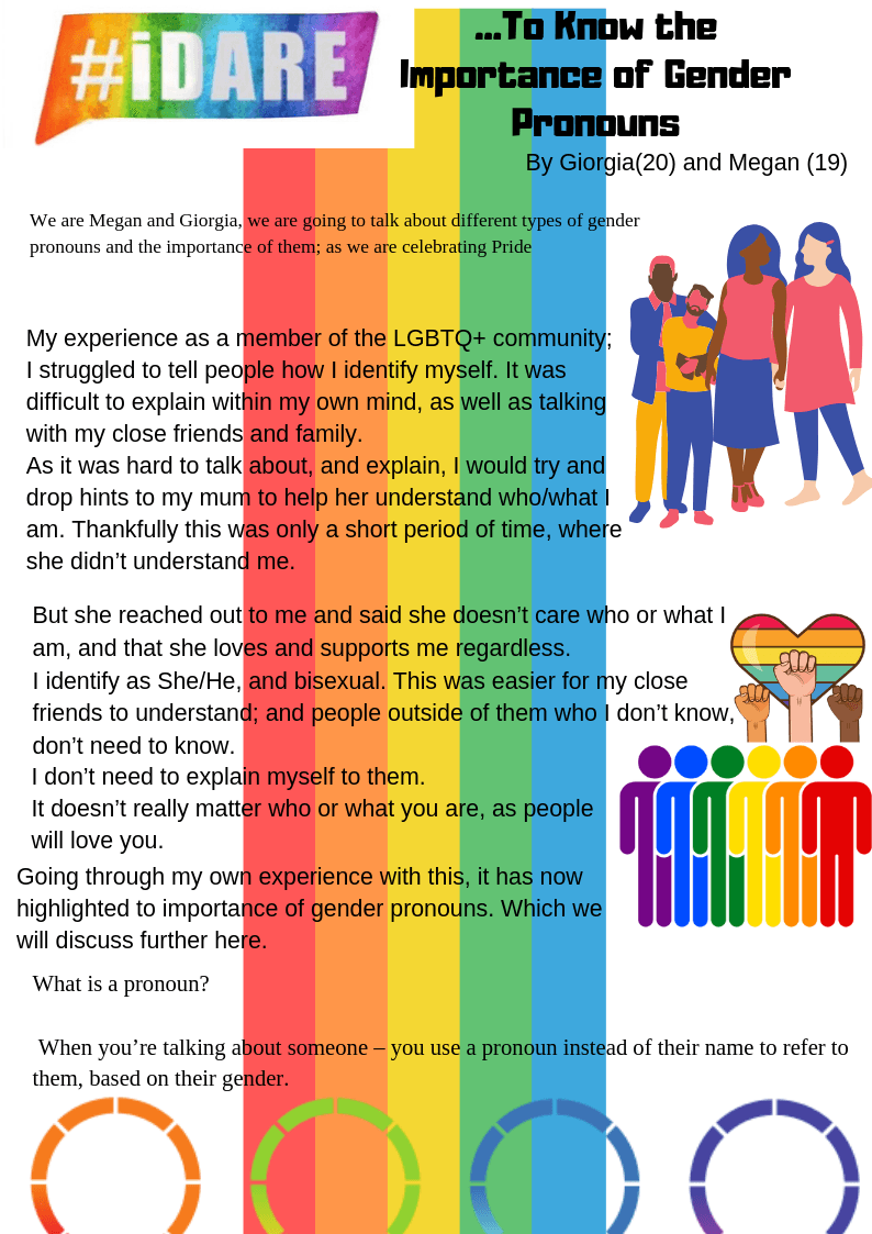 My experience as a member of the LGBTQ+ community; I struggled to tell people how I identify myself. It was difficult to explain within my own mind, as well as talking with my close friends and family. As it was hard to talk about, and explain, I would try and drop hints to my mum to help her understand who/what I am. Thankfully this was only a short period of time, where she didn’t understand me. But she reached out to me and said she doesn’t care who or what I am, and that she loves and supports me regardless. I identify as She/He, and bisexual. This was easier for my close friends to understand; and people outside of them who I don’t know, don’t need to know. I don’t need to explain myself to them. It doesn’t really matter who or what you are, as people will love you.