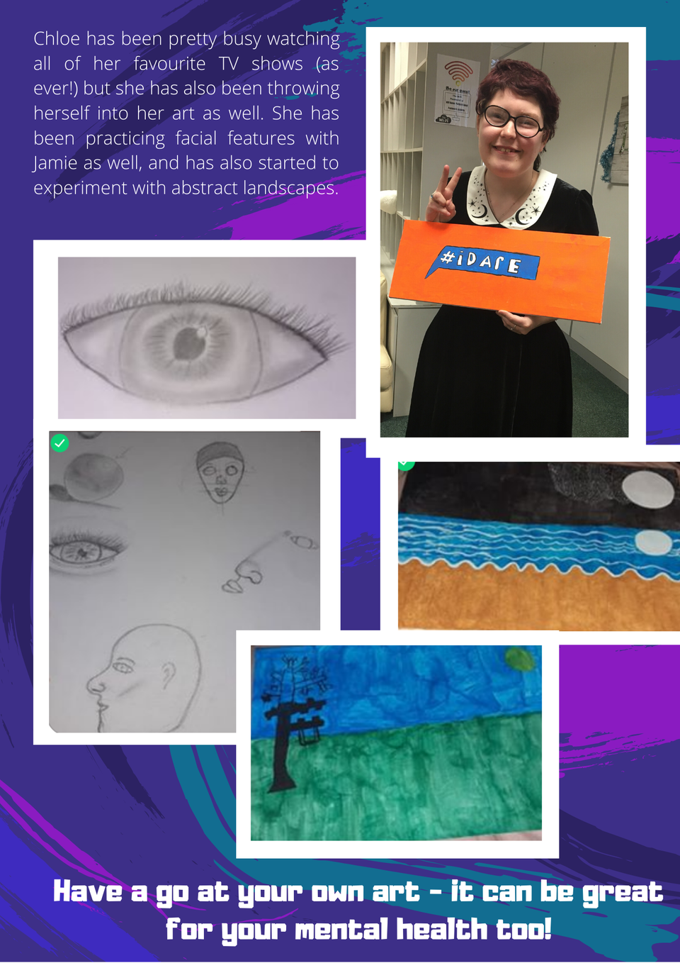 Chloe has been pretty busy watching all of her favourite TV shows (as ever!) but she has also been throwing herself into her art as well. She has been practicing facial features with Jamie as well, and has also started to experiment with abstract landscapes.