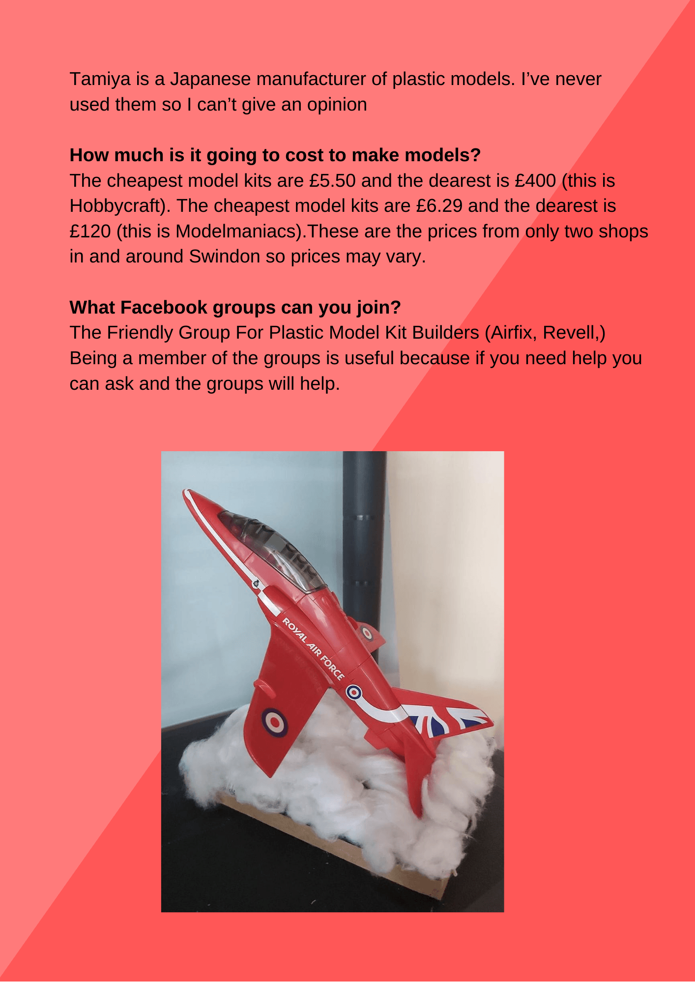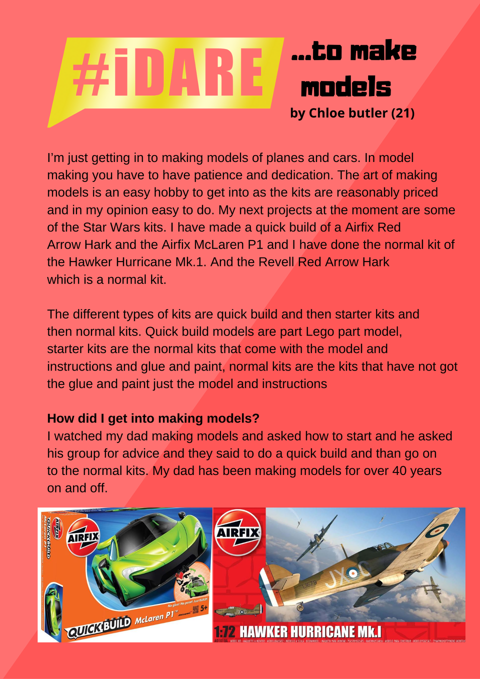 I’m just getting in to making models of planes and cars. In model making you have to have patience and dedication. The art of making