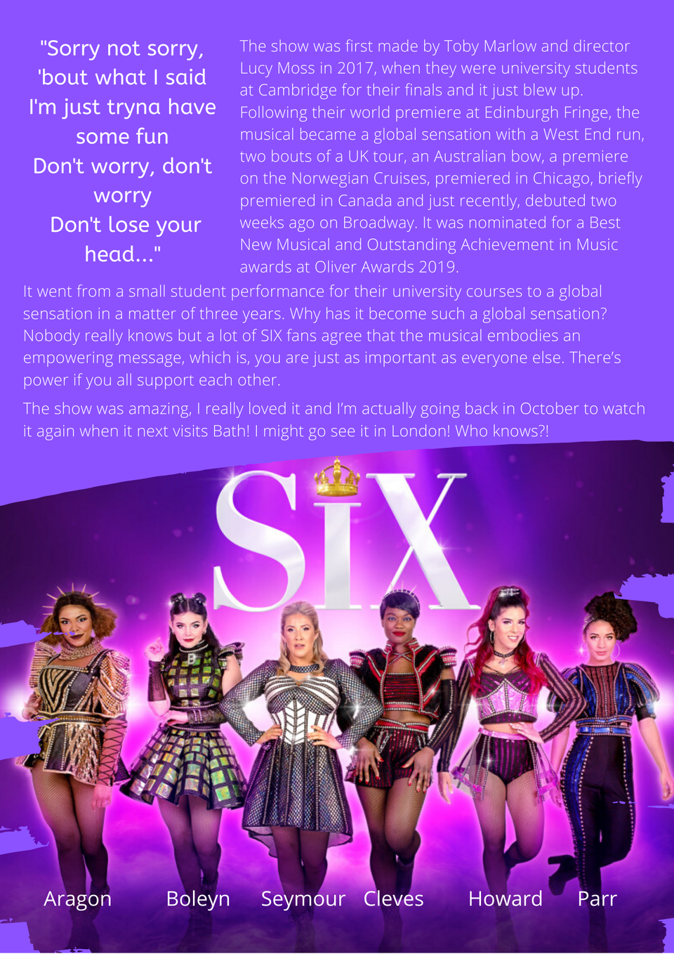 It went from a small student performance for their university courses to a global sensation in a matter of three years. Why has it become such a global sensation? Nobody really knows but a lot of SIX fans agree that the musical embodies an empowering message, which is, you are just as important as everyone else. There’s power if you all support each other.