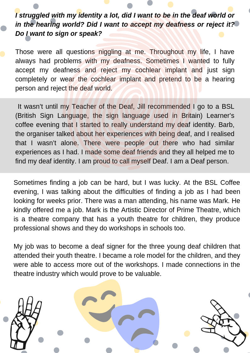 I struggled with my identity a lot, did I want to be in the deaf world or in the hearing world? Did I want to accept my deafness or reject it? Do I want to sign or speak? Those were all questions niggling at me. Throughout my life, I have always had problems with my deafness. Sometimes I wanted to fully accept my deafness and reject my cochlear implant and just sign completely or wear the cochlear implant and pretend to be a hearing person and reject the deaf world. It wasn’t until my Teacher of the Deaf, Jill recommended I go to a BSL (British Sign Language, the sign language used in Britain) Learner’s coffee evening that I started to really understand my deaf identity. Barb, the organiser talked about her experiences with being deaf, and I realised that I wasn’t alone. There were people out there who had similar experiences as I had. I made some deaf friends and they all helped me to find my deaf identity. I am proud to call myself Deaf. I am a Deaf person.