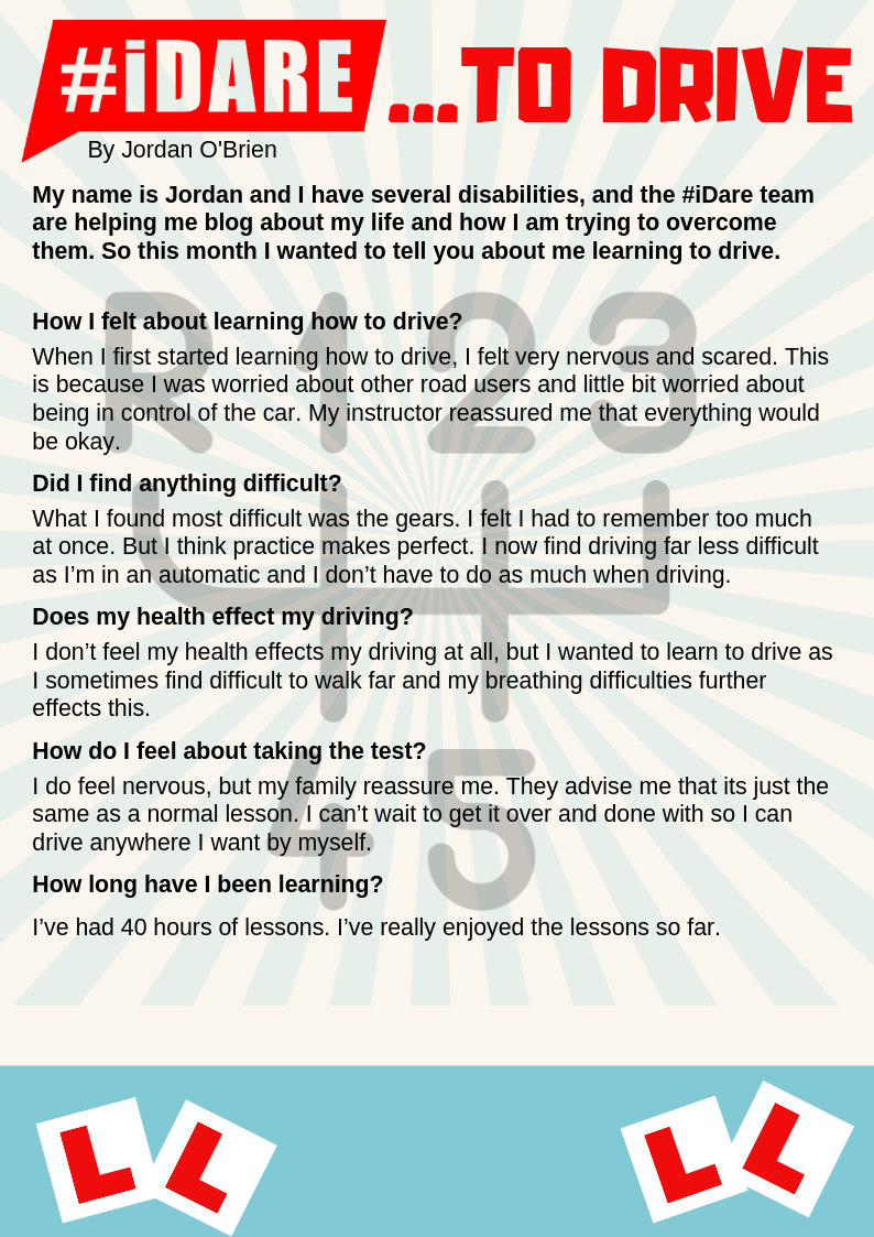 My name is Jordan and I have several disabilities, and the #iDare team are helping me blog about my life and how I am trying to overcome them. So this month I wanted to tell you about me learning to drive.