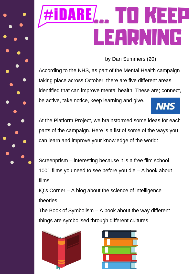 According to the NHS, as part of the Mental Health campaign taking place across October, there are five different areas identified that can improve mental health. These are; connect, be active, take notice, keep learning and give.