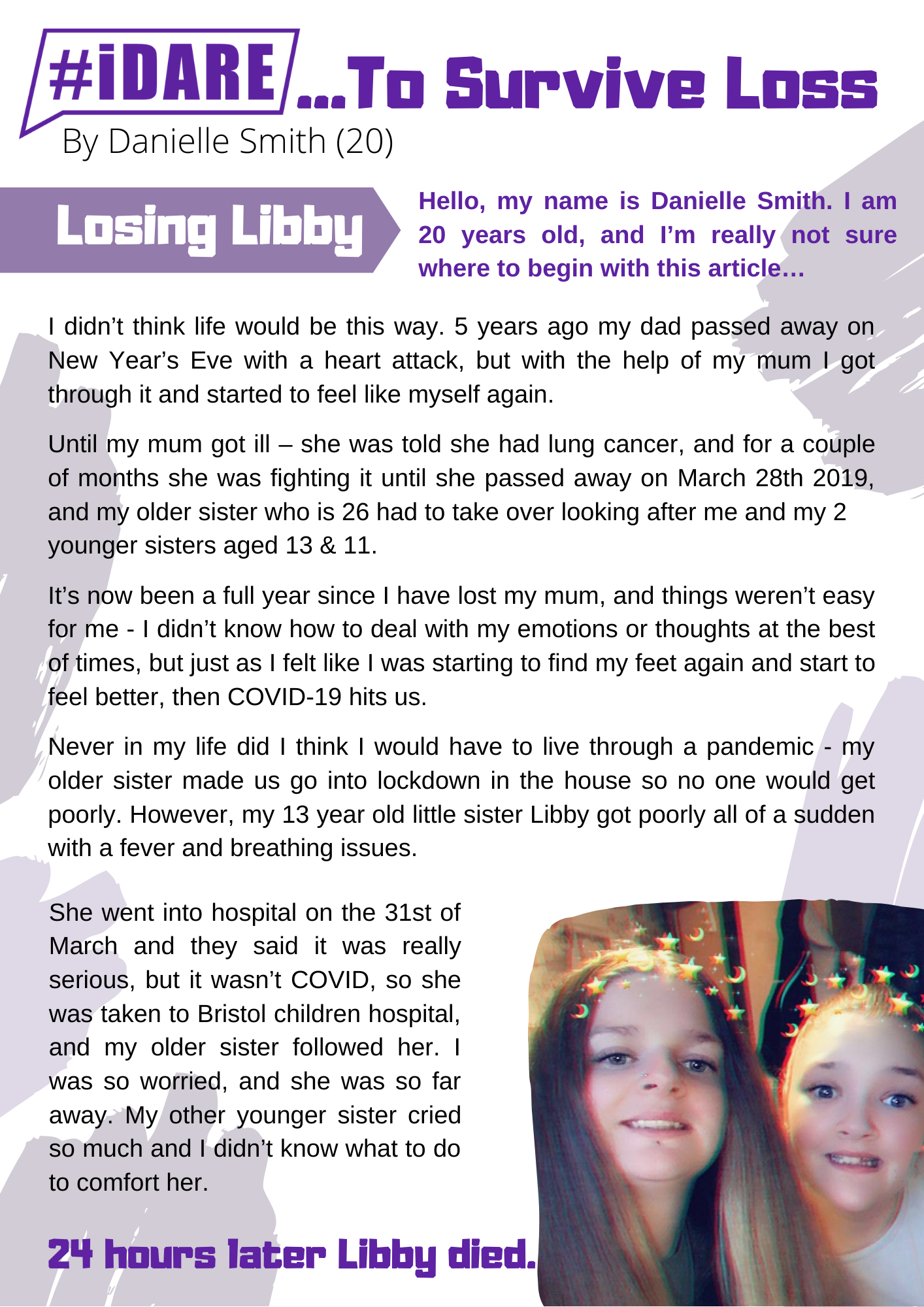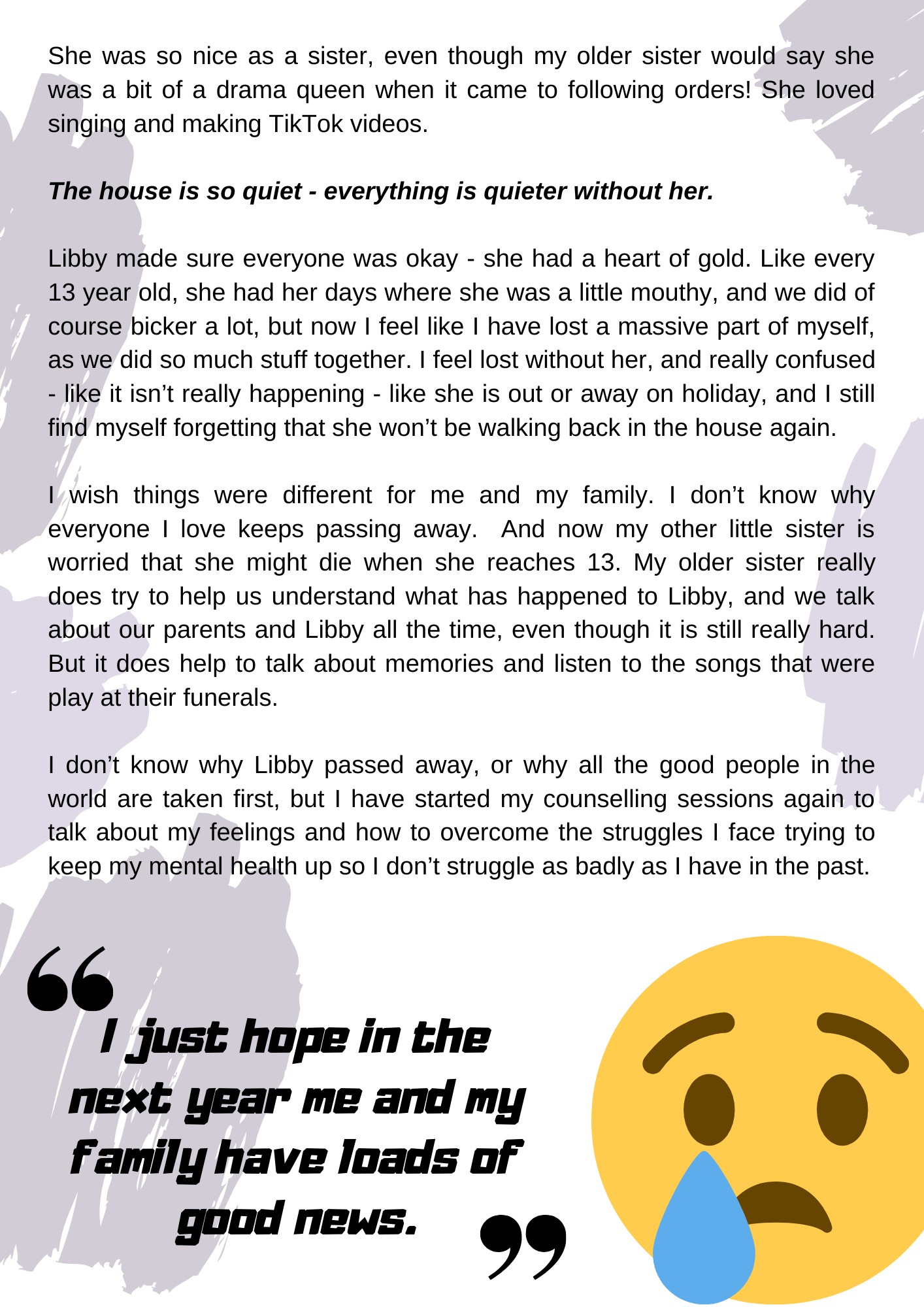 And now my other little sister is worried that she might die when she reaches 13. My older sister really does try to help us understand what has happened to Libby, and we talk about our parents and Libby all the time, even though it is still really hard. But it does help to talk about memories and listen to the songs that were play at their funerals.