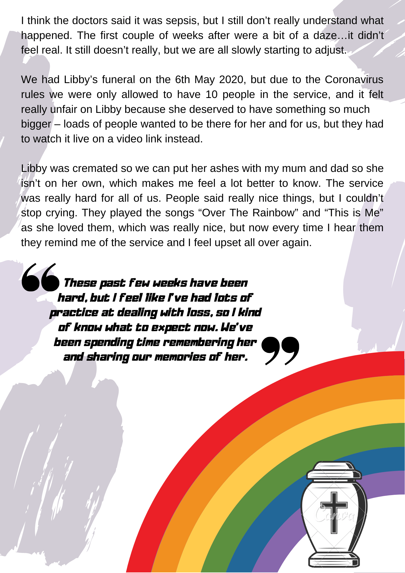 Libby was cremated so we can put her ashes with my mum and dad so she isn’t on her own, which makes me feel a lot more better to know. The service was really hard for all of us. People said really nice things, but I couldn’t stop crying. They played the songs “Over The Rainbow” and “This is Me” as she loved them, which was really nice, but now every time I hear them they remind me of the service and I feel upset all over again.