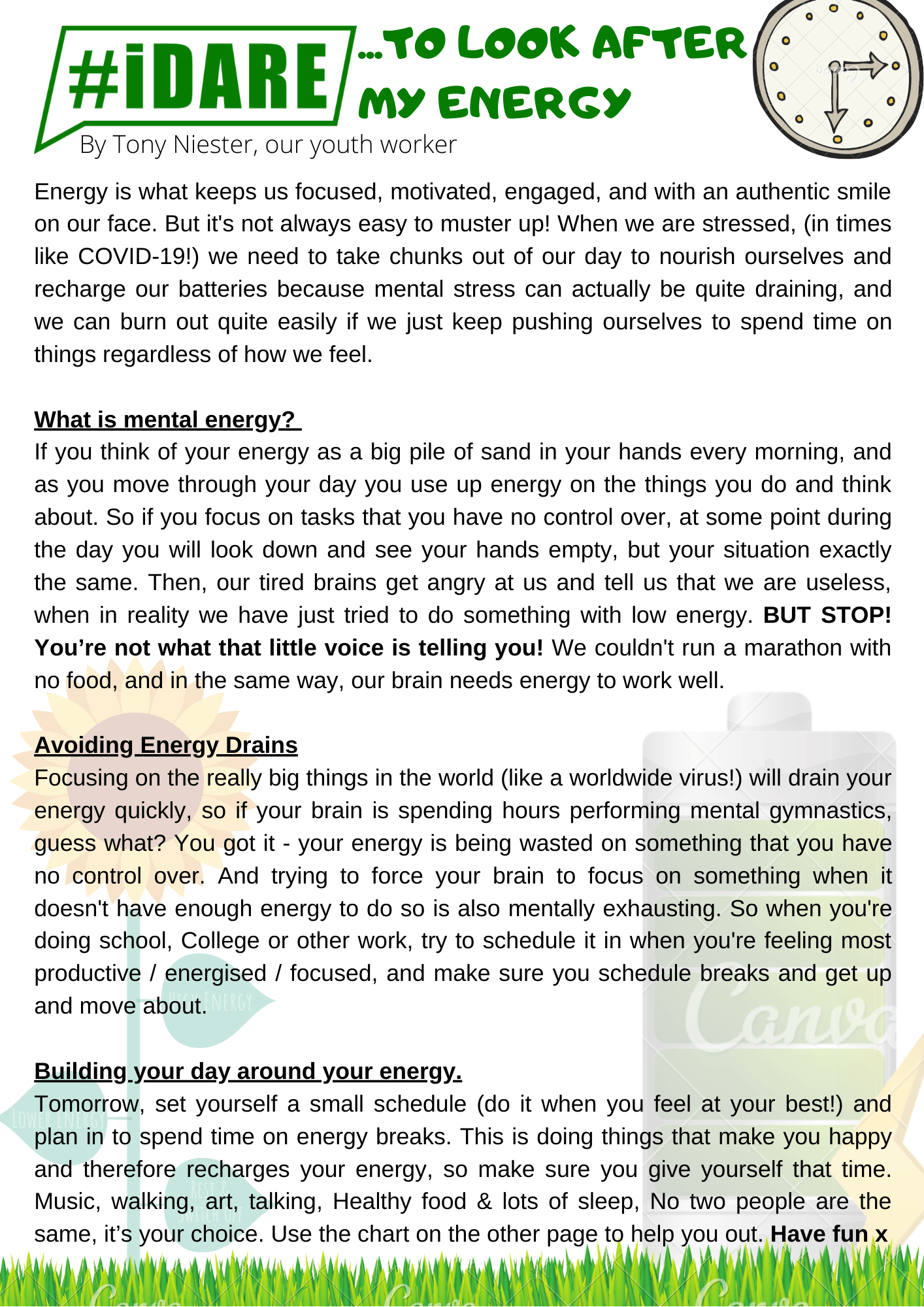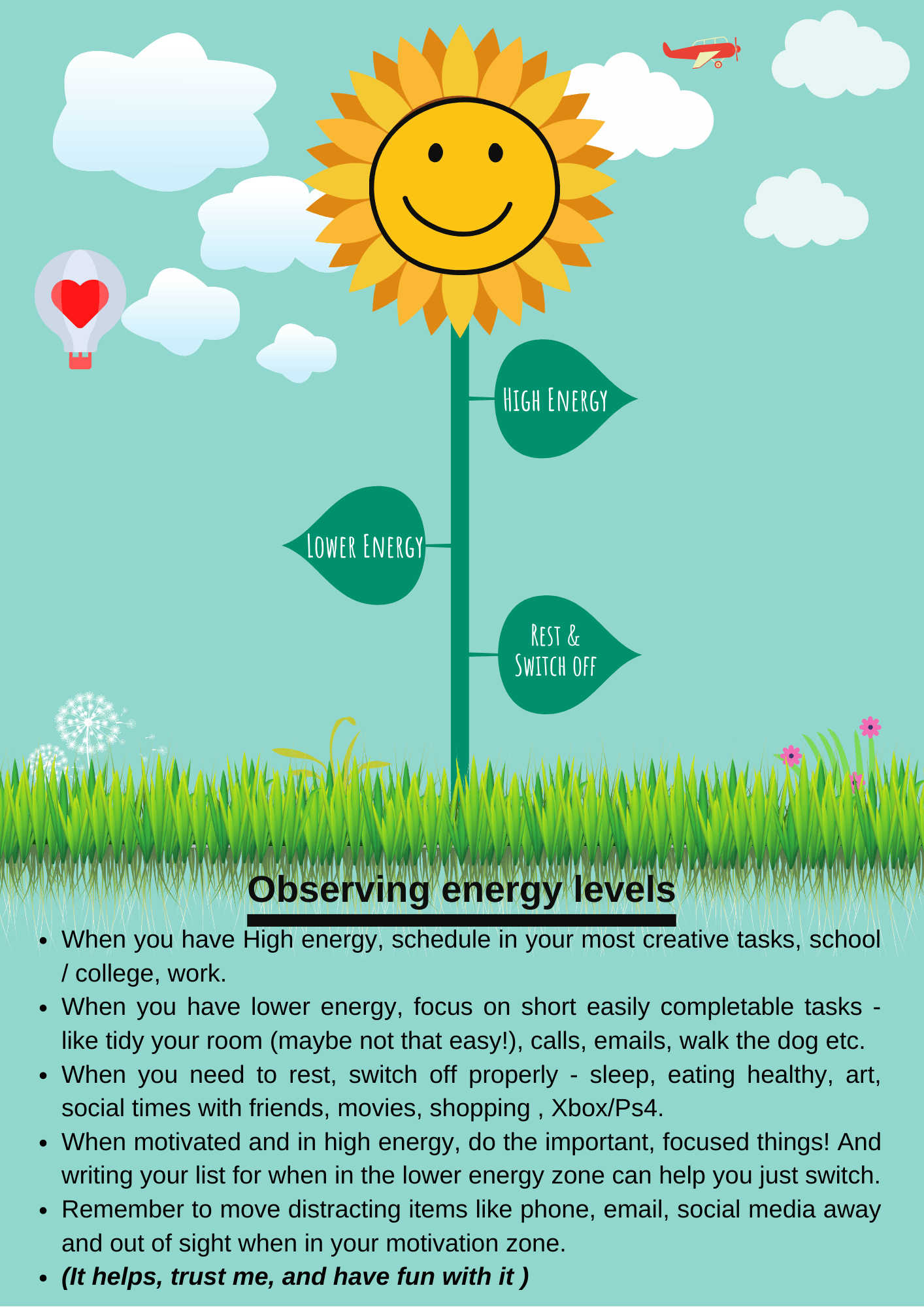 Tomorrow, set yourself a small schedule (do it when you feel at your best!) and plan in to spend time on energy breaks. This is doing things that make you happy and therefore recharges your energy, so make sure you give yourself that time. Music, walking, art, talking, Healthy food & lots of sleep, No two people are the same, it’s your choice. Use the chart below to help you out. Have fun x