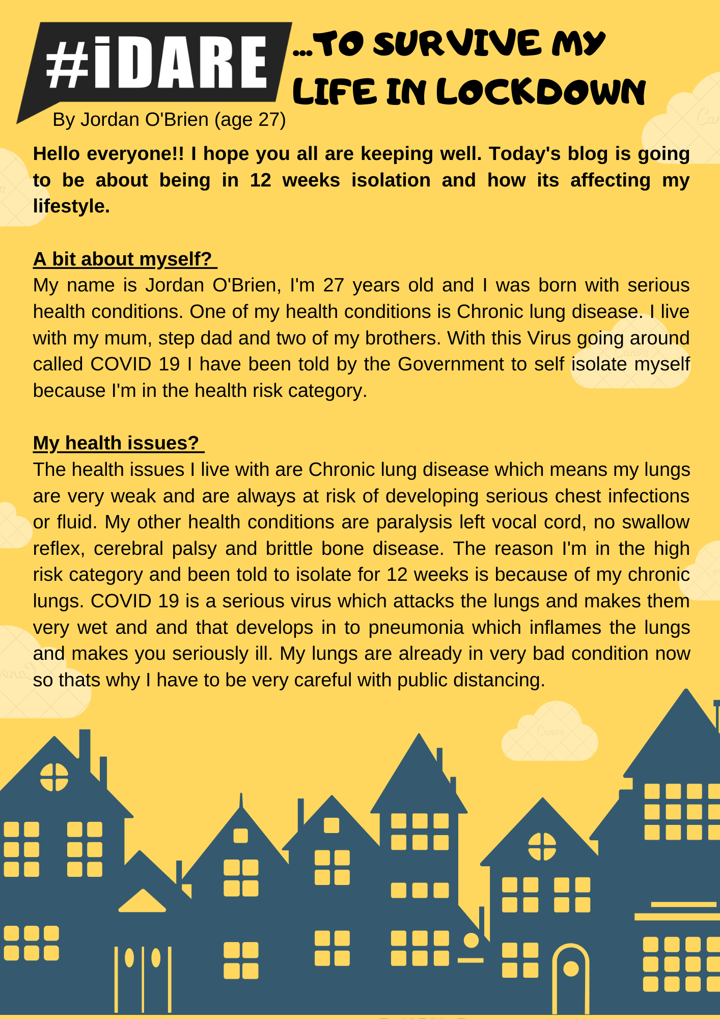 My name is Jordan O'Brien, I'm 27 years old and I was born with serious health conditions. One of my health conditions is Chronic lung disease. I live with my mum, step dad and two of my brothers. With this Virus going around called COVID 19 I have been told by the Government to self isolate myself because I'm in the health risk category.