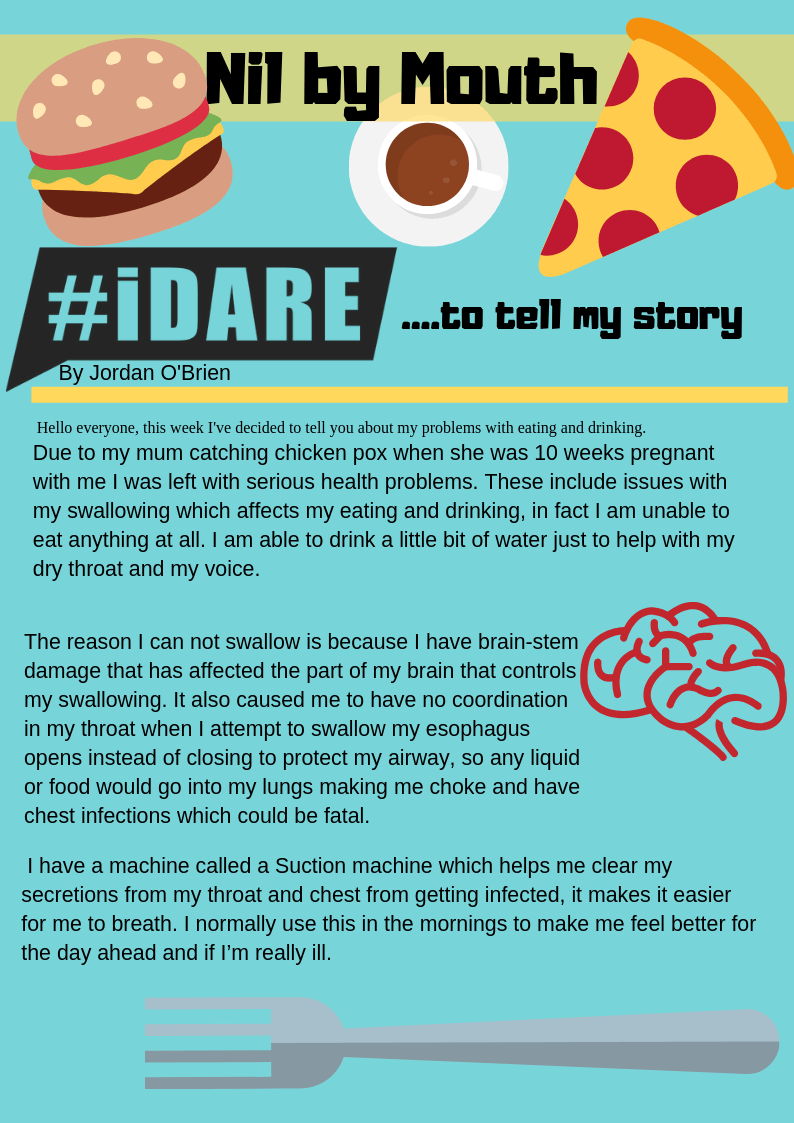 Due to my mum catching chicken pox when she was 10 weeks pregnant with me I was left with serious health problems. These include issues with my swallowing which affects my eating and drinking, in fact i am unable to eat anything at all. I am able to drink a little bit of water just to help with my dry throat and my voice. The reason i can not swallow is because I have brain-stem damage that has affected the part of my brain that controls my swallowing. It also caused me to have no coordination in my throat when I attempt to swallow my esophagus opens instead of closing to protect my airway, so any liquid or food would go into my lungs making me choke and have chest infections which could be fatal.