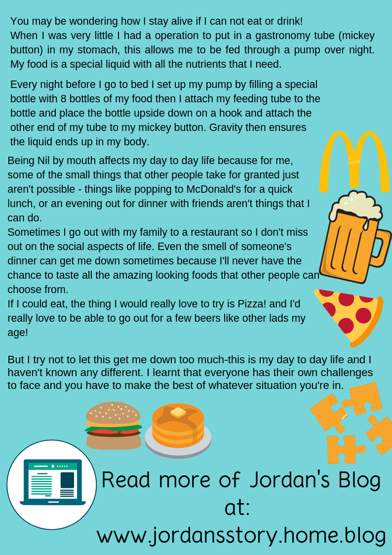 Being Nil by mouth affects my day to day life because for me, some of the small things that other people take for granted just aren't possible - things like popping to McDonald's for a quick lunch, or an evening out for dinner with friends aren't things that I can do. Sometimes I go out with my family to a restaurant so I don't miss out on the social aspects of life. Even the smell of someone's dinner can get me down sometimes because I'll never have the chance to taste all the amazing looking foods that other people can choose from. If I could eat the thing I would really love to try is Pizza! and I'd really love to be able to go out for a few beers like other lads my age!