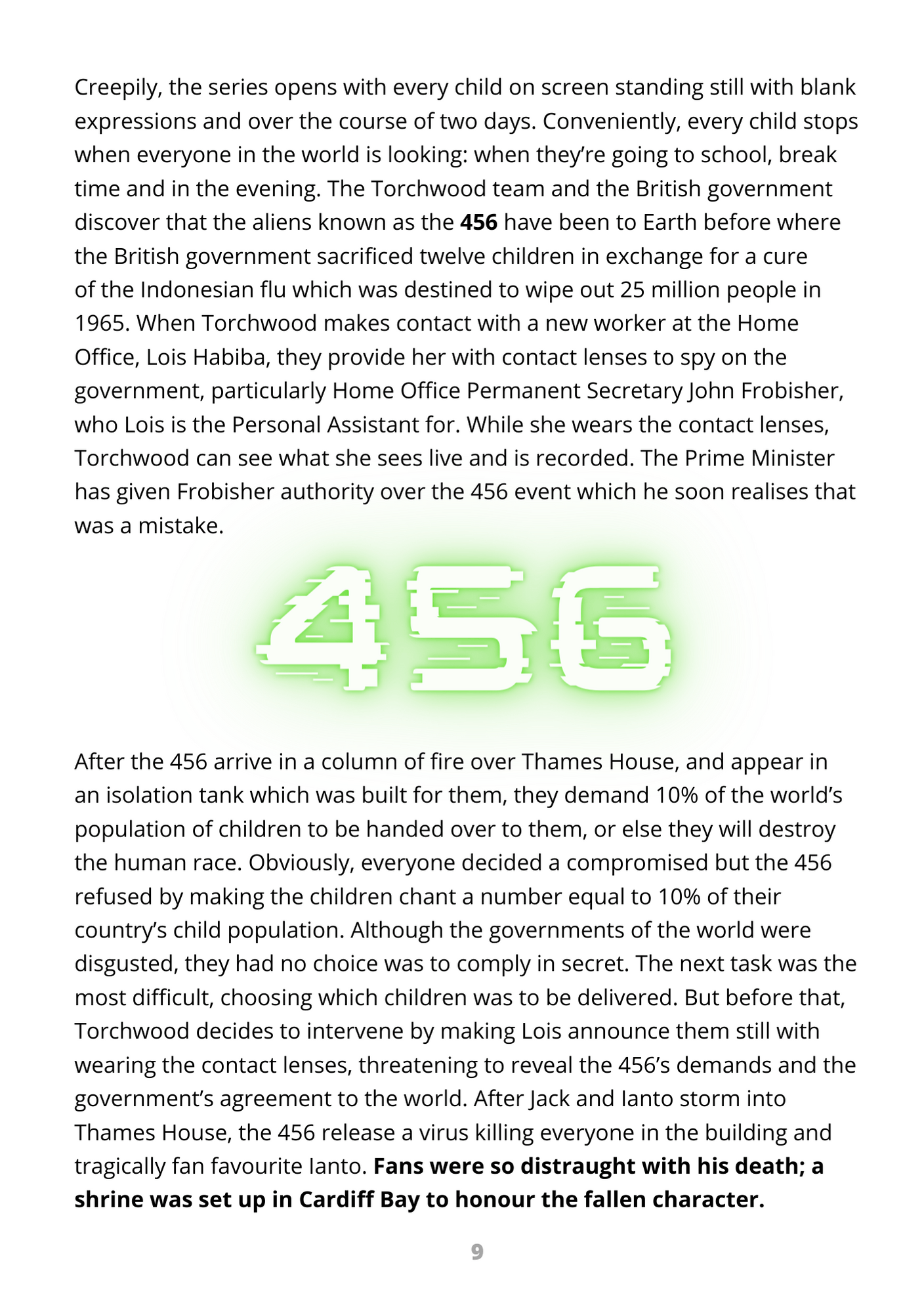 After the 456 arrive in a column of fire over Thames House, and appear in an isolation tank which was built for them, they demand 10% of the world’s population of children to be handed over to them, or else they will destroy the human race. Obviously, everyone decided a compromised but the 456 refused by making the children chant a number equal to 10% of their country’s child population. Although the governments of the world were disgusted, they had no choice was to comply in secret. The next task was the most difficult, choosing which children was to be delivered. But before that, Torchwood decides to intervene by making Lois announce them still with wearing the contact lenses, threatening to reveal the 456’s demands and the government’s agreement to the world. After Jack and Ianto storm into Thames House, the 456 release a virus killing everyone in the building and tragically fan favourite Ianto. Fans were so distraught with his death; a shrine was set up in Cardiff Bay to honour the fallen character.