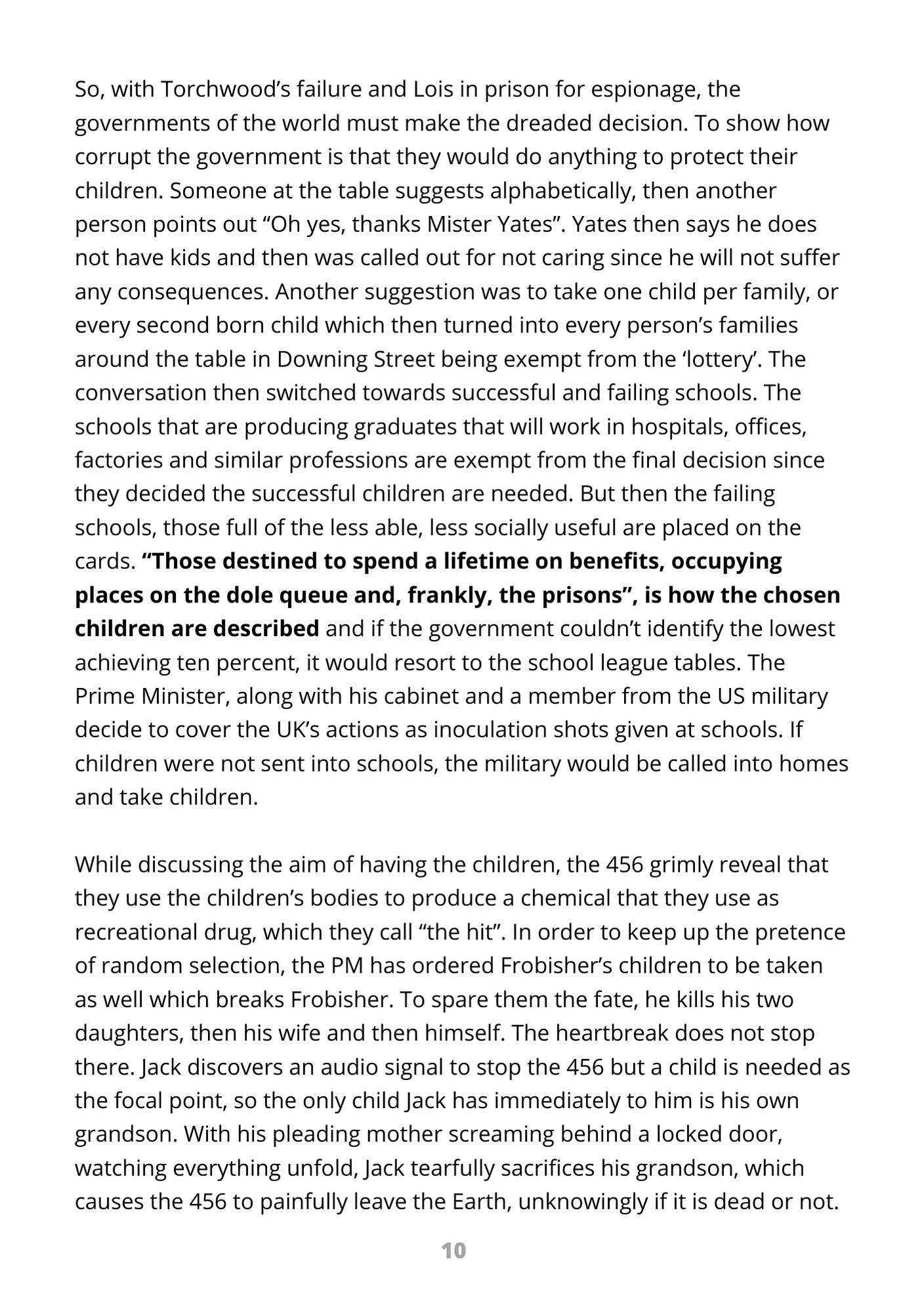 So, with Torchwood’s failure and Lois in prison for espionage, the governments of the world must make the dreaded decision. To show how corrupt the government is that they would do anything to protect their children. Someone at the table suggests alphabetically, then another person points out “Oh yes, thanks Mister Yates”. Yates then says he does not have kids and then was called out for not caring since he will not suffer any consequences. Another suggestion was to take one child per family, or every second born child which then turned into every person’s families around the table in Downing Street being exempt from the ‘lottery’. The conversation then switched towards successful and failing schools. The schools that are producing graduates that will work in hospitals, offices, factories and similar professions are exempt from the final decision since they decided the successful children are needed. But then the failing schools, those full of the less able, less socially useful are placed on the cards. “Those destined to spend a lifetime on benefits, occupying places on the dole queue and, frankly, the prisons”, is how the chosen children are described and if the government couldn’t identify the lowest achieving ten percent, it would resort to the school league tables. The Prime Minister, along with his cabinet and a member from the US military decide to cover the UK’s actions as inoculation shots given at schools. If children were not sent into schools, the military would be called into homes and take children.