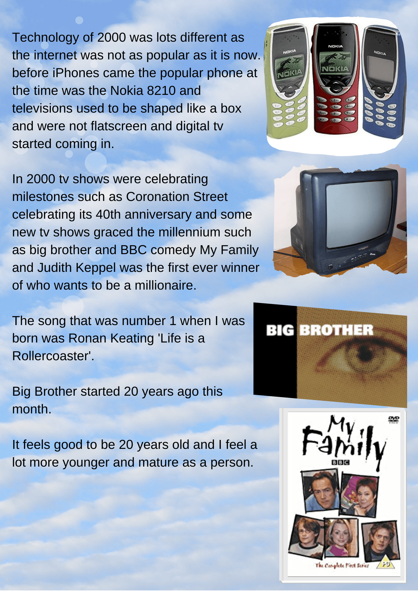 Technology of 2000 was lots different as the internet was not as popular as it is now. before iPhones came the popular phone at the time was the Nokia 8210 and televisions used to be shaped like a box and were not flatscreen and digital tv started coming in.