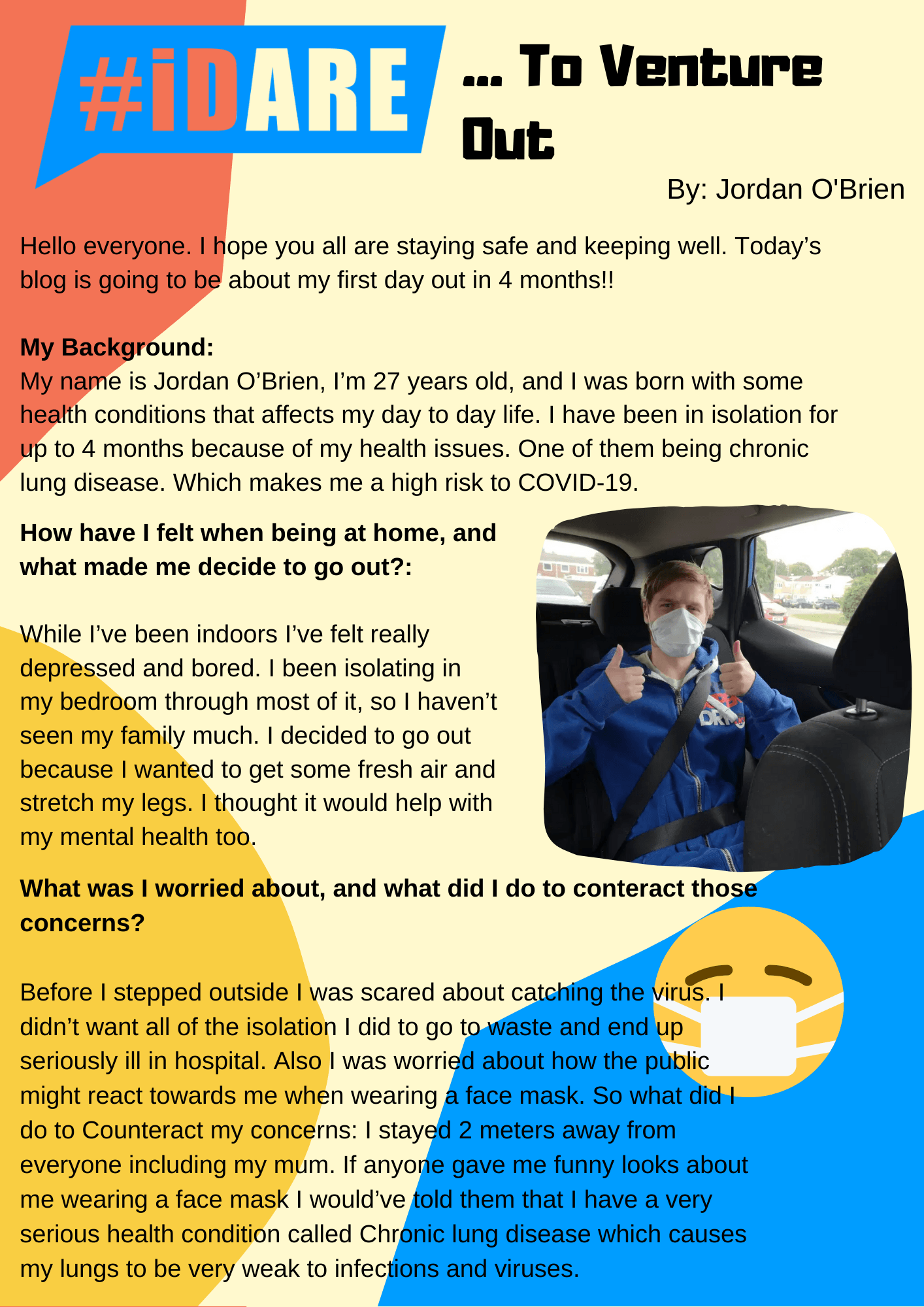 Hello everyone. I hope you all are staying safe and keeping well. Today's blog is going to be about my first day out in 4 months!! My Background: My name is Jordan O'Brien, I'm 27 years old, and I was born with some health conditions that affects my day to day life.