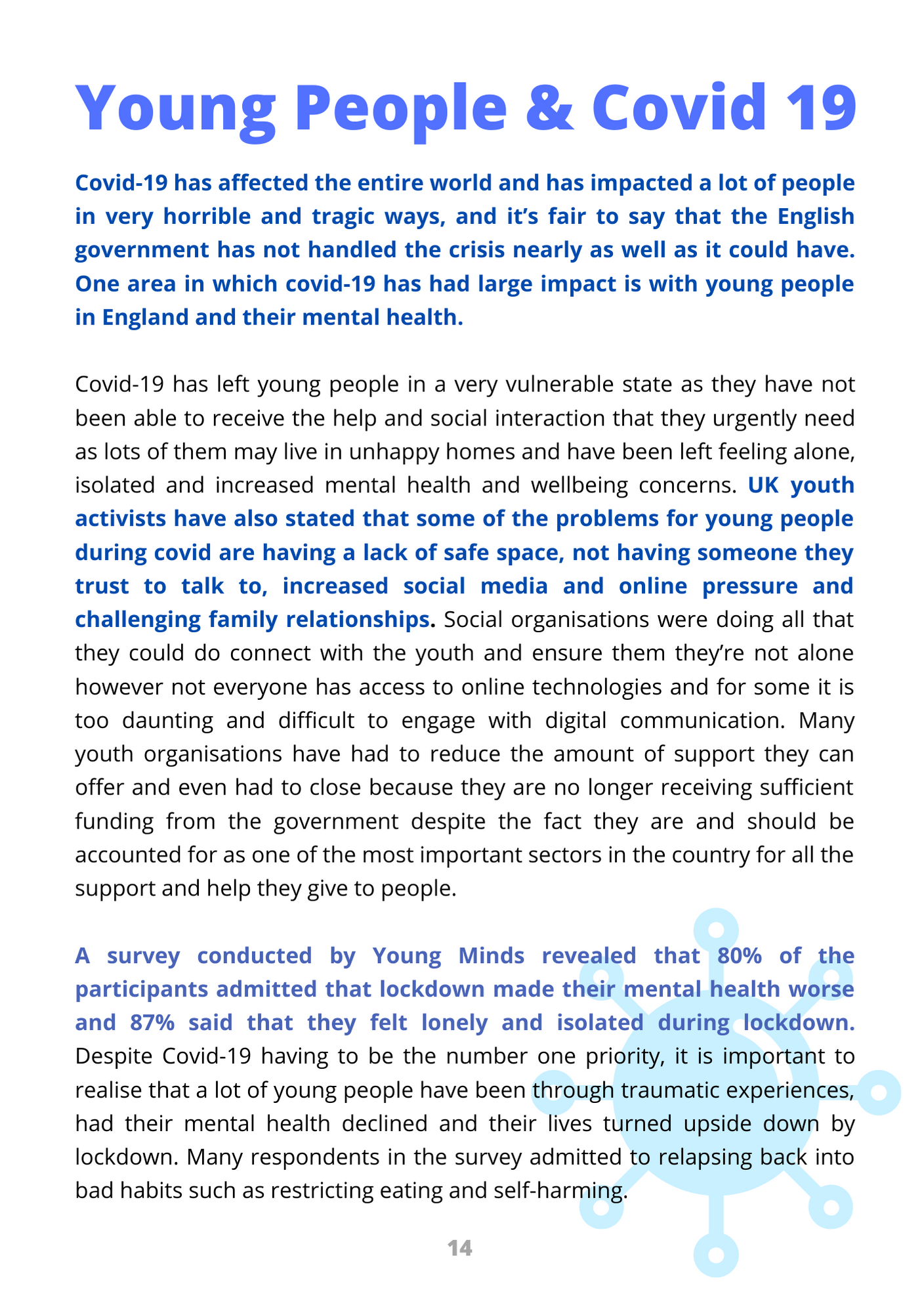 Covid-19 has left young people in a very vulnerable state as they have not been able to receive the help and social interaction that they urgently need as lots of them may live in unhappy homes and have been left feeling alone, isolated and increased mental health and wellbeing concerns. The UK youth activists have also stated that some of the problems for young people during covid are having a lack of safe space, not having someone they trust to talk to, increased social media and online pressure and challenging family relationships. Social organisations were doing all that they could do connect with the youth and ensure them they’re not alone however not everyone has access to online technologies and for some it is too daunting and difficult to engage with digital communication. Many youth organisations have had to reduce the amount of support they can offer and even had to close because they are no longer receiving sufficient funding from the government despite the fact they are and should be accounted for as one of the most important sectors in the country for all the support and help they give to people.