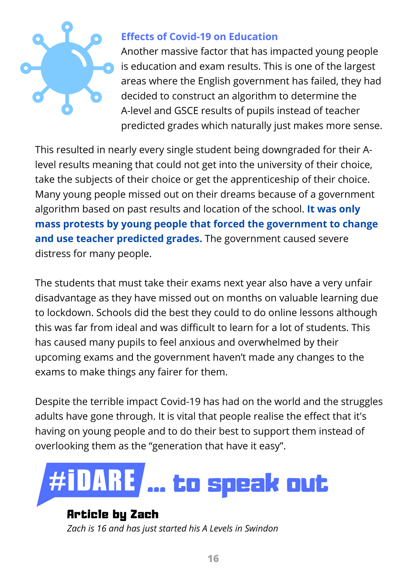 Another massive factor that has impacted young people is education and exam results. This is one of the largest areas where the English government has failed, they had decided to construct an algorithm to determine the a-level and GSCE results of pupils instead of teacher predicted grades which naturally just makes more sense. This resulted in nearly every single student being downgraded for their A-level results meaning that could not get into the university of their choice, take the subjects of their choice or get the apprenticeship of their choice. Many young people missed out on their dreams because of a government algorithm based on past results and location of the school. It was only mass protests by young people that forced the government to change and use teacher predicted grades. The government caused severe distress for many people. The students that must take their exams next year also have a very unfair disadvantage as they have missed out on months on valuable learning due to lockdown. Schools did the best they could to do online lessons although this was far from ideal and was difficult to learn for a lot of students. This has caused many pupils to feel anxious and overwhelmed by their upcoming exams and the government haven’t made any changes to the exams to make things any fairer for them.