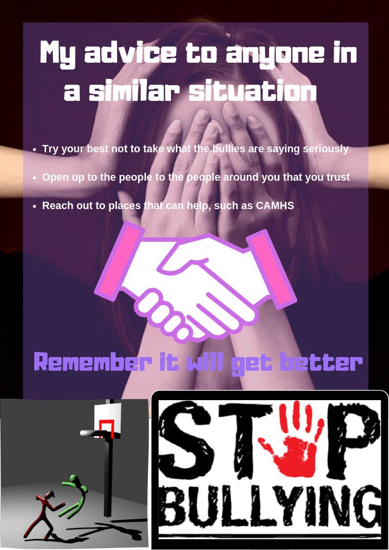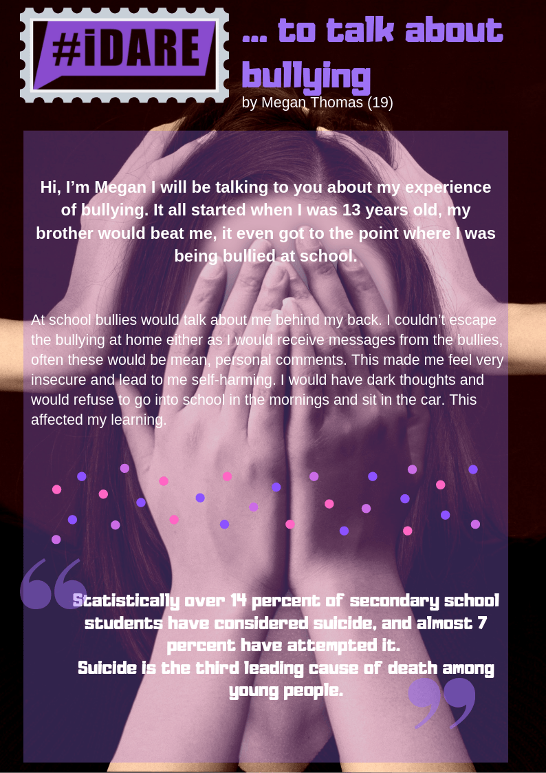Hi, I’m Megan I will be talking to you about my experience of bullying. It all started when I was 13 years old, my brother would beat me, it even got to the point where I was being bullied at school.