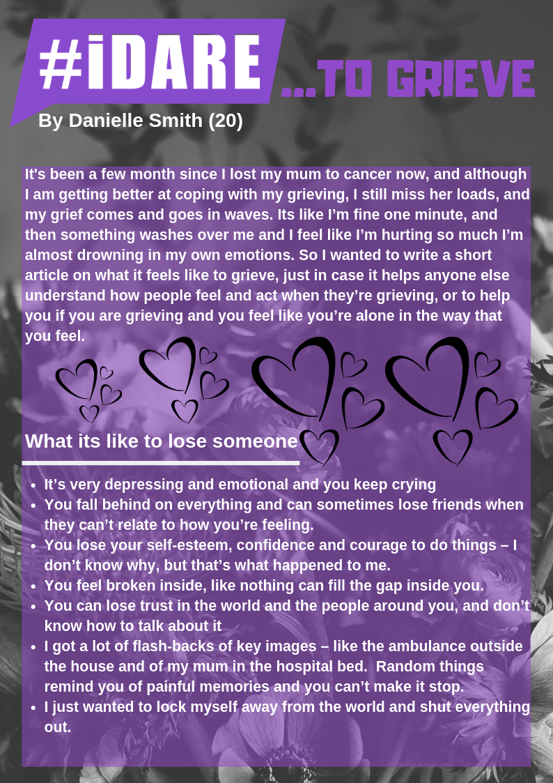 I didn’t deal with my grief very well when my dad died a number of years ago, so although I am still struggling now, I really want to manage my grief better this time. If I don’t I’m afraid that my health will suffer, I might lose lots of weight again, and my thoughts about suicide (wanting to be with my mum) might get stronger, so I’m making sure that I talk to the people around me and access the specialist services that can help me though it.
