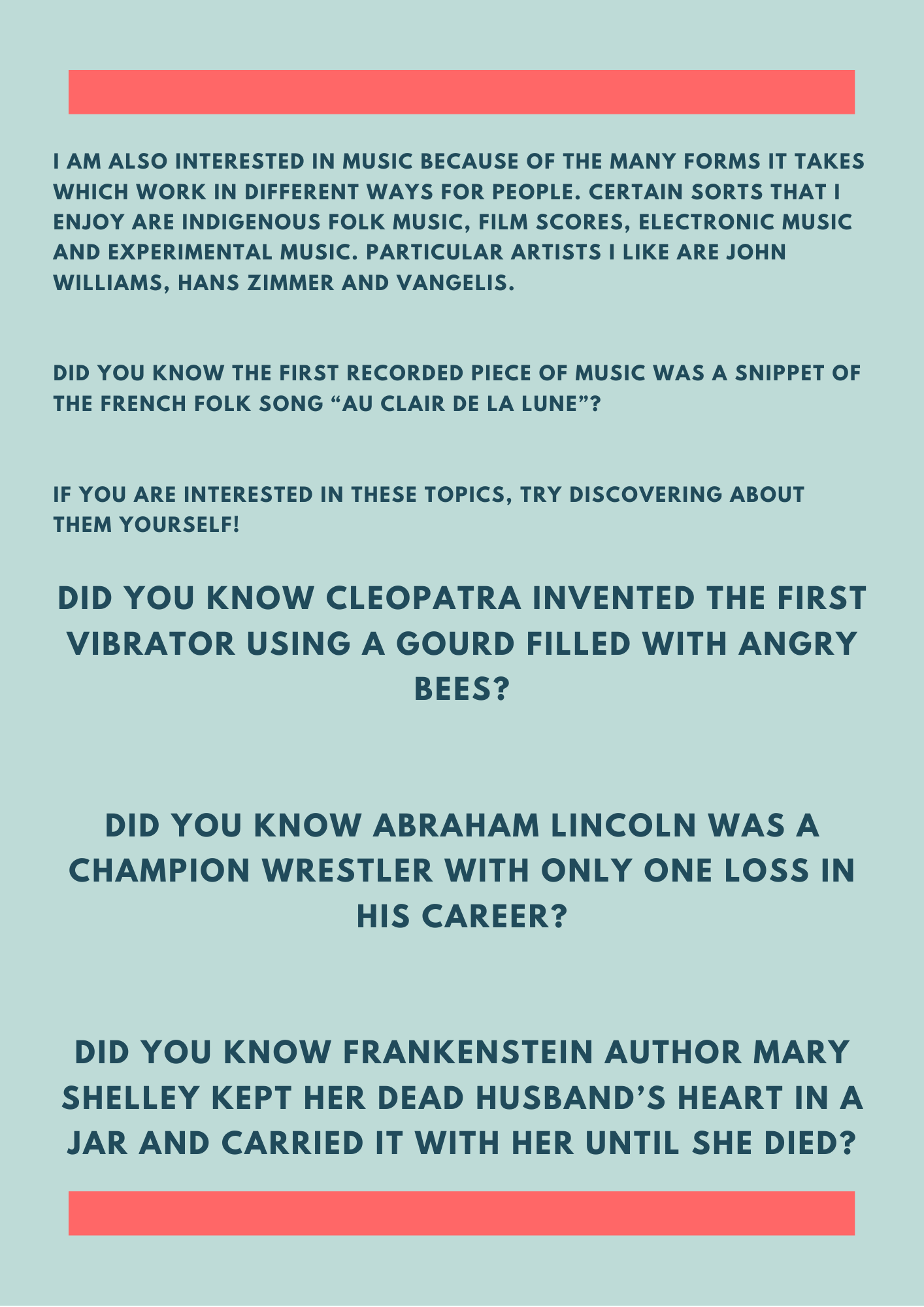 I am also interested in music because of the many forms it takes which work in different ways for people. Certain sorts that I enjoy are indigenous folk music, film scores, electronic music and experimental music. Particular artists I like are John Williams, Hans Zimmer and Vangelis.