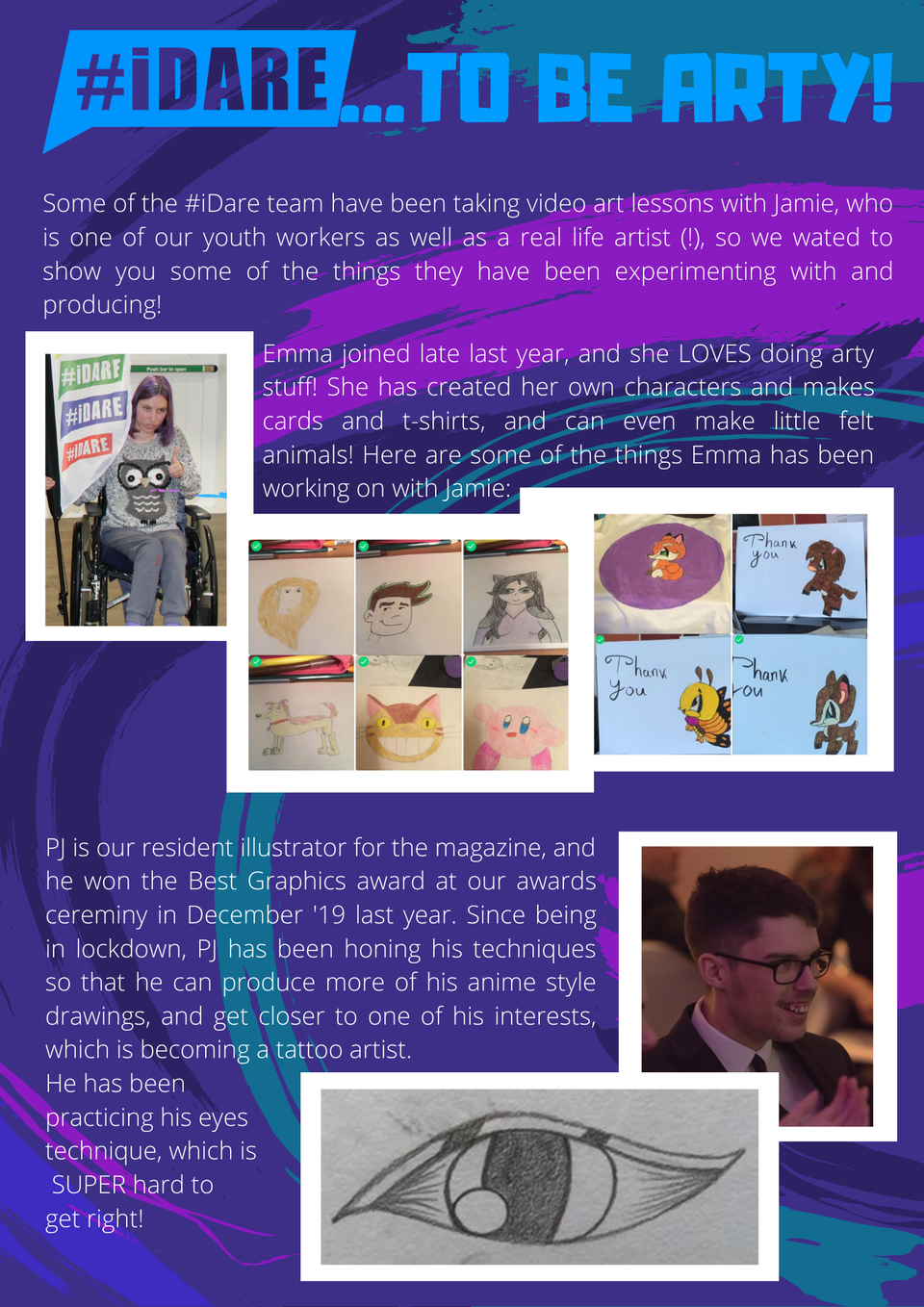 PJ is our resident illustrator for the magazine, and he won the Best Graphics award at our awards cereminy in December '19 last year. Since being in lockdown, PJ has been honing his techniques so that he can produce more of his anime style drawings, and get closer to one of his interests, which is becoming a tattoo artist. He has been practicing his eyes technique, which is SUPER hard to get right!