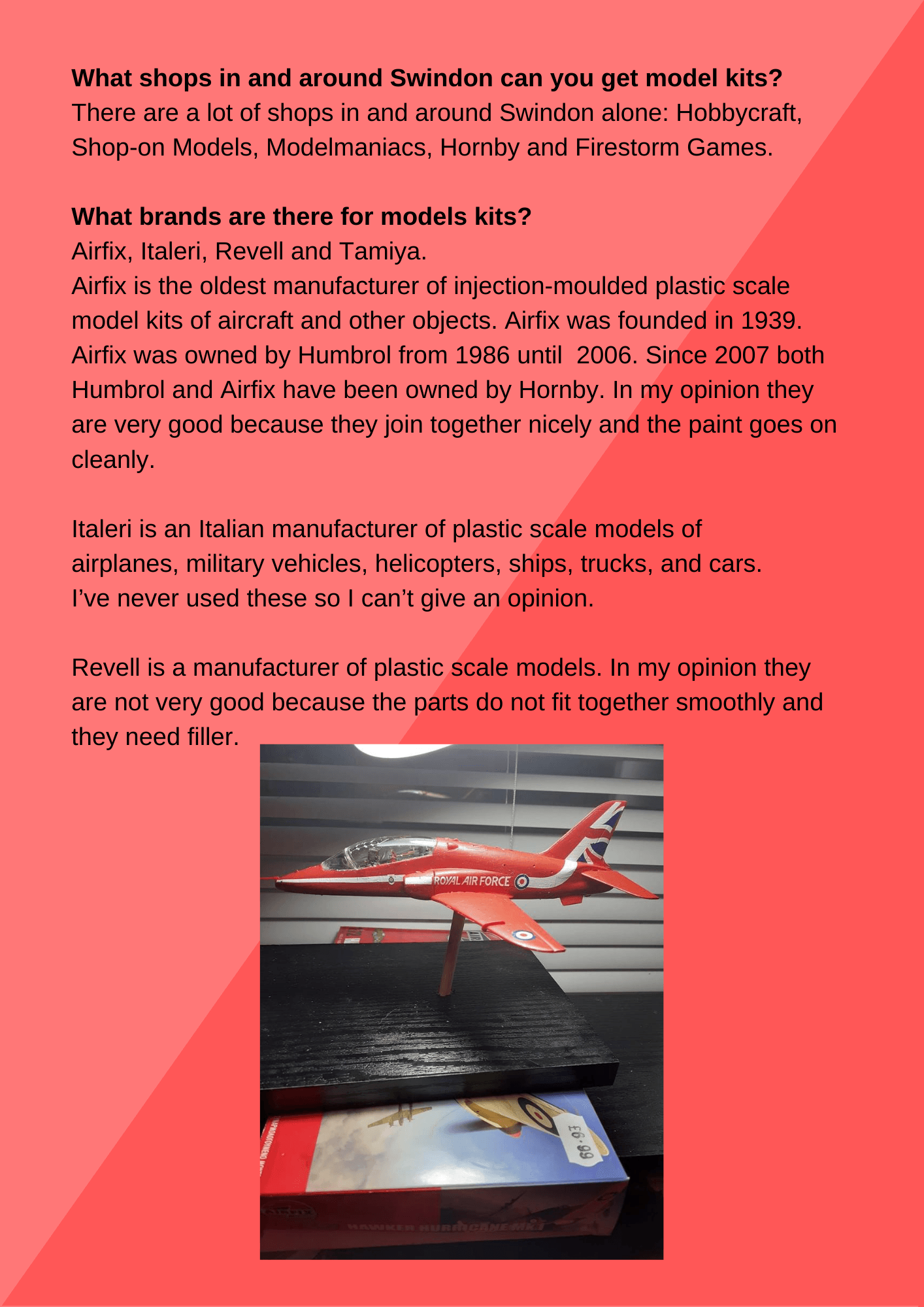 the Hawker Hurricane Mk.1. And the Revell Red Arrow Hark which is a normal kit.