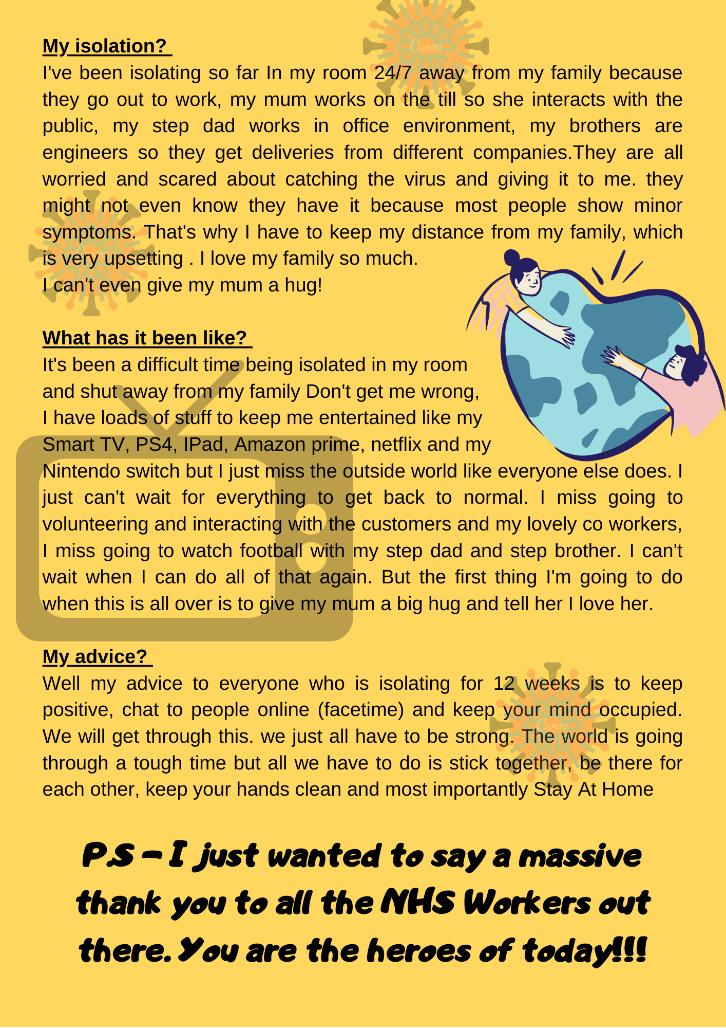 It's been a difficult time being isolated in my room and shut away from my family Don't get me wrong, I have loads of stuff to keep me entertained like my Smart TV, PS4, IPad, Amazon prime, netflix and my Nintendo switch but I just miss the outside world like everyone else does. I just can't wait for everything to get back to normal. I miss going to volunteering and interacting with the customers and my lovely co workers, I miss going to watch football with my step dad and step brother. I can't wait when I can do all of that again. But the first thing I'm going to do when this is all over is to give my mum a big hug and tell her I love her.