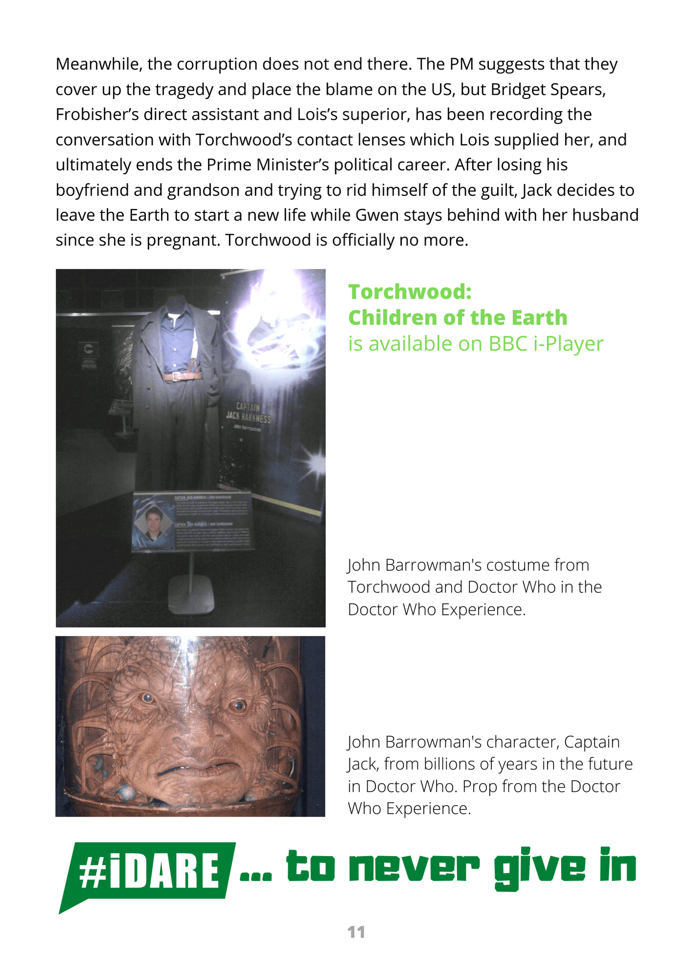 After the 456 arrive in a column of fire over Thames House, and appear in an isolation tank which was built for them, they demand 10% of the world’s population of children to be handed over to them, or else they will destroy the human race. Obviously, everyone decided a compromised but the 456 refused by making the children chant a number equal to 10% of their country’s child population. Although the governments of the world were disgusted, they had no choice was to comply in secret. The next task was the most difficult, choosing which children was to be delivered. But before that, Torchwood decides to intervene by making Lois announce them still with wearing the contact lenses, threatening to reveal the 456’s demands and the government’s agreement to the world. After Jack and Ianto storm into Thames House, the 456 release a virus killing everyone in the building and tragically fan favourite Ianto. Fans were so distraught with his death; a shrine was set up in Cardiff Bay to honour the fallen character.