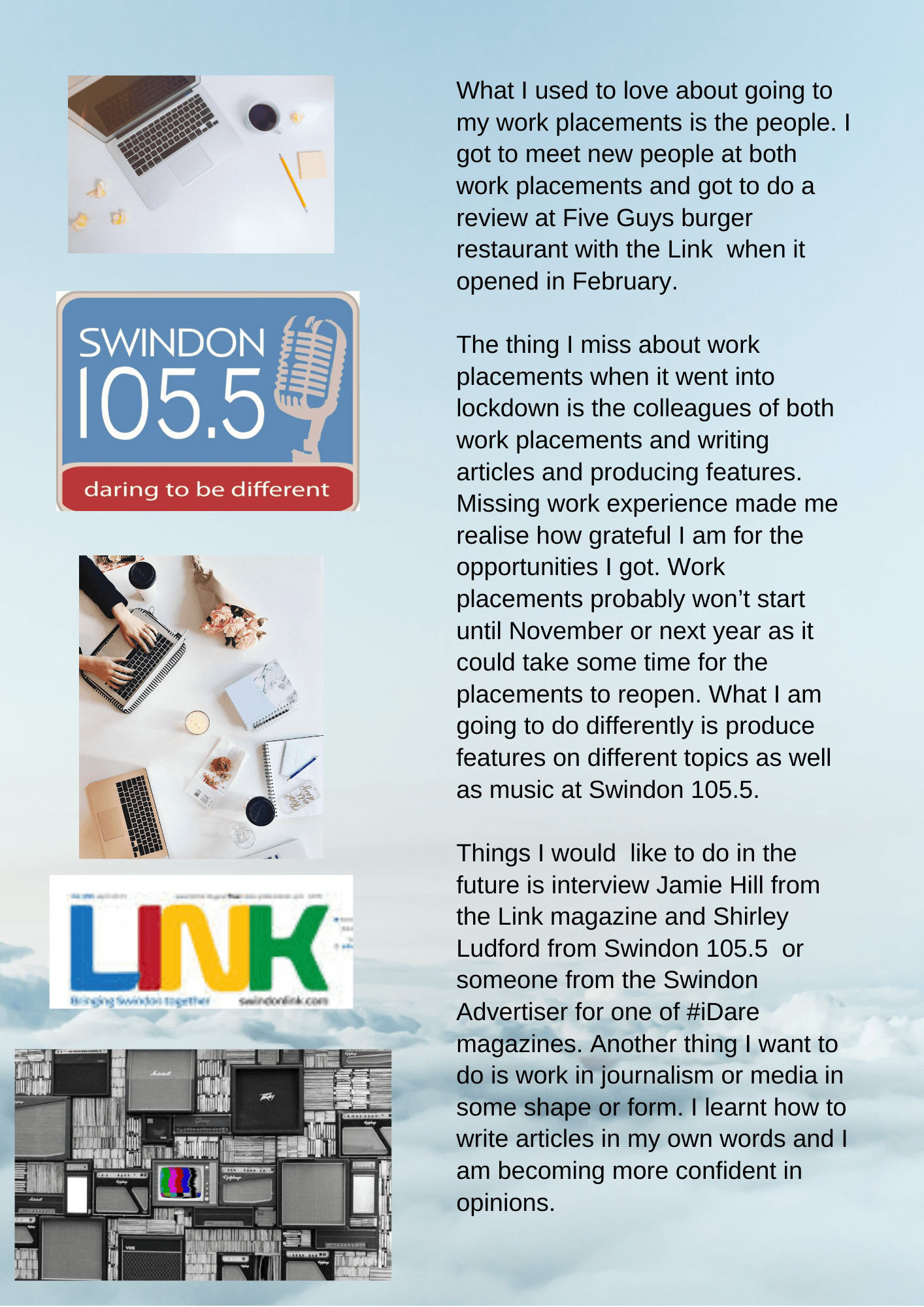 The thing I miss about work placements when it went into lockdown is the colleagues of both work placements and writing articles and producing features. Missing work experience made me realise how grateful I am for the opportunities I got. Work placements probably won’t start until November or next year as it could take some time for the placements to reopen. What I am going to do differently is produce features on different topics as well as music at Swindon 105.5.