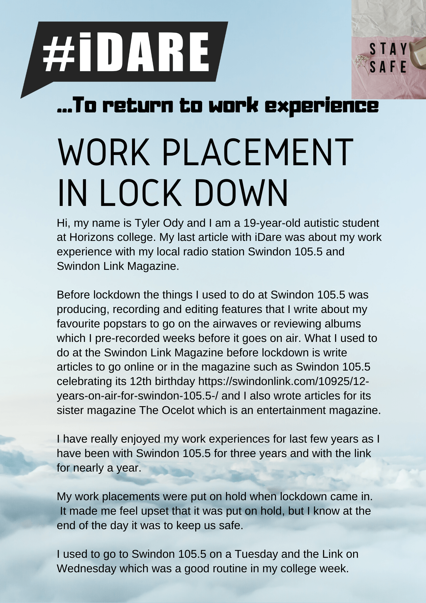 Hi, my name is Tyler Ody and I am a 19-year-old autistic student at Horizons college. My last article with iDare was about my work experience with my local radio station Swindon 105.5 and Swindon Link Magazine.